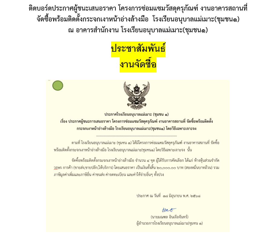ประกาศผู้ชนะเสนอราคาจัดซื้อพร้อมติดตั้งกระจกเงาหน้าอ่างล้างมือ โครงการซ่อมแซมวัสดุครุภัณฑ์ งานอาคารสถานที่ โรงเรียนอนุบาลแม่เมาะ(ชุมชน1)