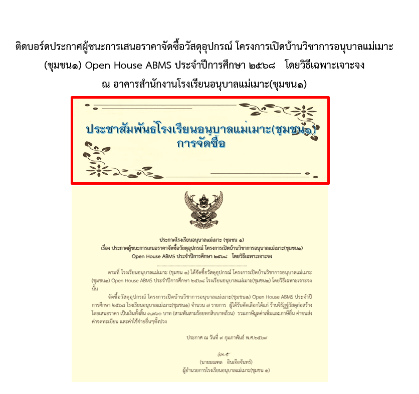 ประกาศผู้ชนะการเสนอราคาจัดซื้อวัสดุอุปกรณ์ โครงการเปิดบ้านวิชาการอนุบาลแม่เมาะ(ชุมชน1)