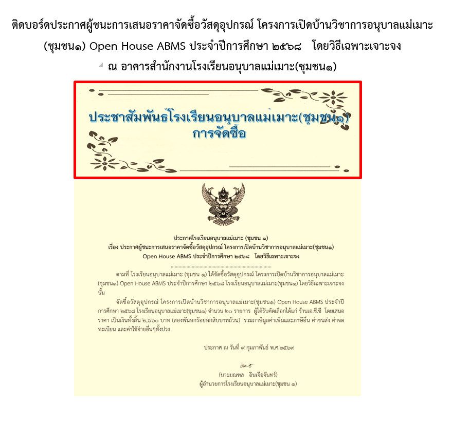 ประกาศผู้ชนะการเสนอราคาจัดซื้อวัสดุอุปกรณ์ โครงการเปิดบ้านวิชาการอนุบาลแม่เมาะ(ชุมชน1)