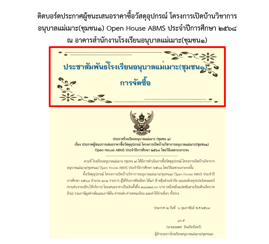 ประกาศผู้ชนะการเสนอราคาซื้อวัสดุอุปกรณ์ โครงการเปิดบ้านวิชาการอนุบาลแม่เมาะ(ชุมชน1)