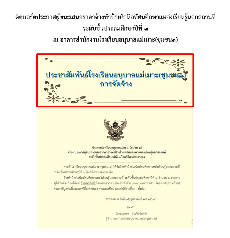 ประกาศผู้ชนะเสนอราคาจ้างทำป้ายไวนิลทัศนศึกษาแหล่งเรียนรู้นอกสถานที่
