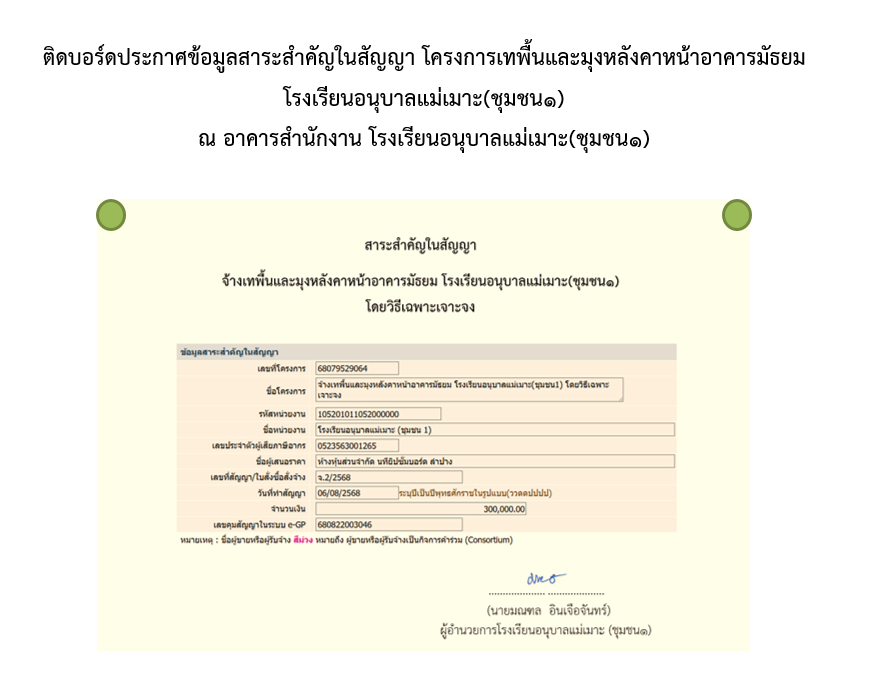 ประกาศข้อมูลสาระสำคัญในสัญญา โครงการเทพื้นและมุงหลังคาหน้าอาคารมัธยม