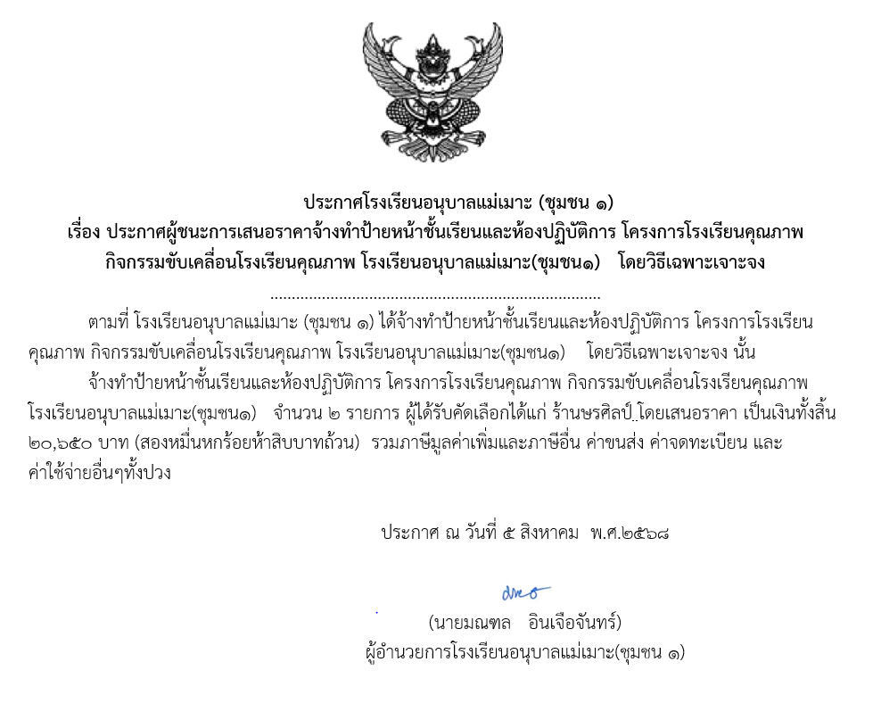 เรื่อง ประกาศผู้ชนะการเสนอราคาจ้างทำป้ายหน้าชั้นเรียนและห้องปฏิบัติการ โครงการโรงเรียนคุณภาพ