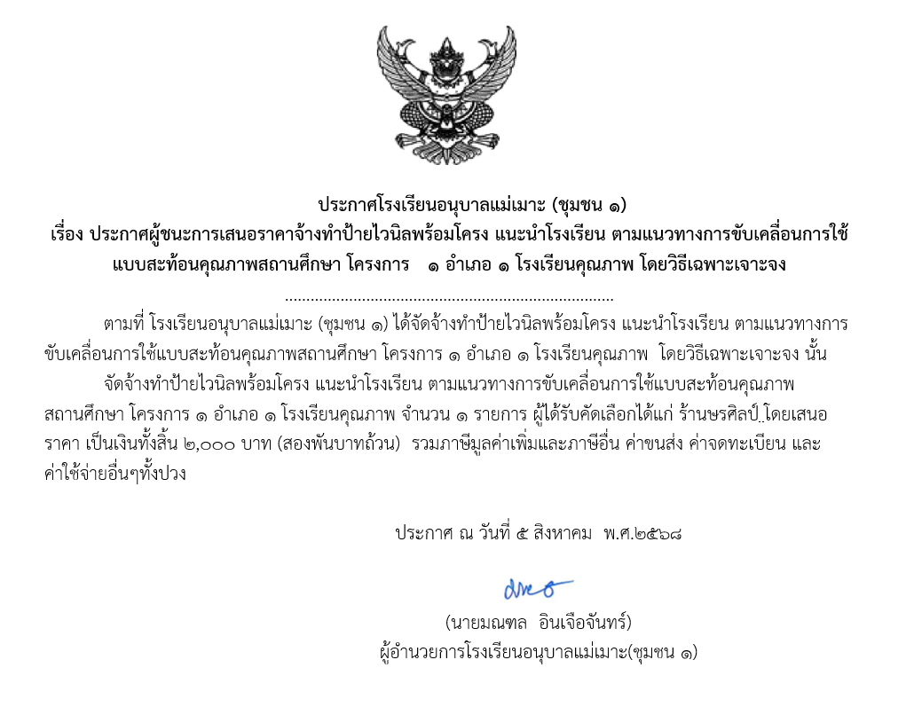 เรื่อง ประกาศผู้ชนะการเสนอราคาจ้างทำป้ายไวนิลพร้อมโครง แนะนำโรงเรียน