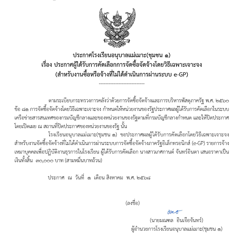 ประกาศผลผู้ได้รับการคัดเลือกโดยวิธีเฉพาะเจาะจง