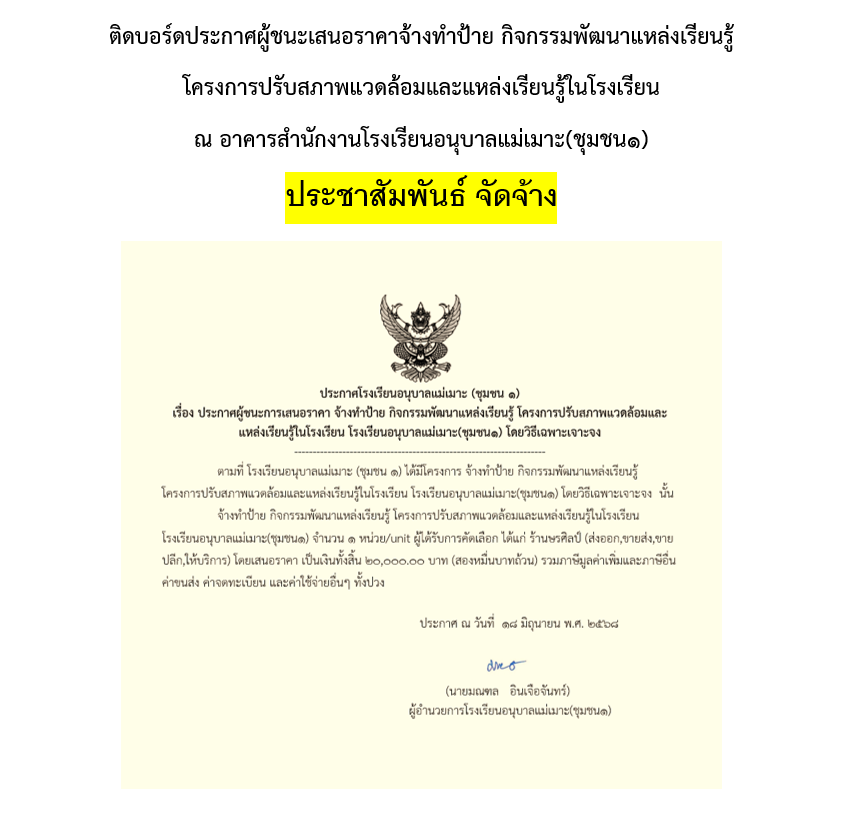ประกาศผู้ชนะเสนอราคาจ้างทำป้าย กิจกรรมพัฒนาแหล่งเรียนรู้ โครงการปรับสภาพแวดล้อมและแหล่งเรียนรู้ในโรงเรียน โรงเรียนอนุบาลแม่เมาะ(ชุมชน1)
