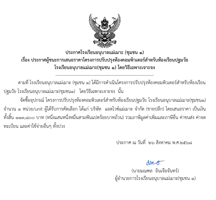 ประกาศโรงเรียนอนุบาลแม่เมาะ (ชุมชน ๑) เรื่อง ประกาศผู้ชนะการเสนอราคาโครงการปรับปรุงห้องคอมพิวเตอร์สำหรับห้องเรียนปฐมวัย