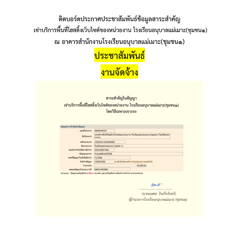 ประกาศประชาสัมพันธ์ข้อมูลสาระสำคัญเช่าบริการพื้นที่โฮสติ้งเว็บไซต์ของหน่วยงาน โรงเรียนอนุบาลแม่เมาะ(ชุมชน1)
