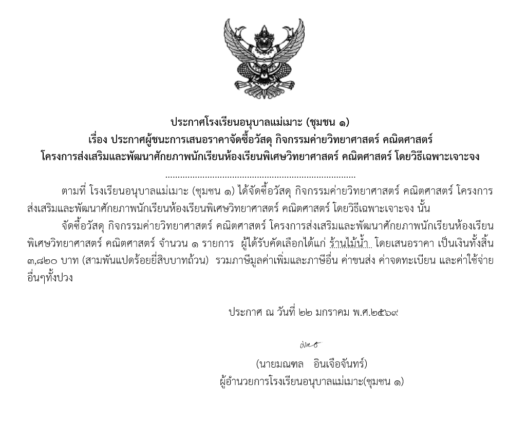 ประกาศผู้ชนะการเสนอราคาจัดซื้อวัสดุ กิจกรรมค่ายวิทยาศาสตร์ คณิตศาสตร์