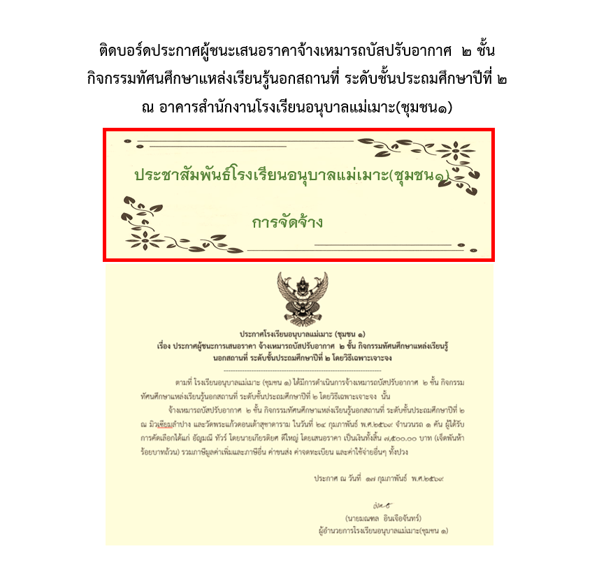 ประกาศผู้ชนะการเสนอราคา จ้างเหมารถบัสปรับอากาศ  ๒ ชั้น กิจกรรมทัศนศึกษาแหล่งเรียนรู้