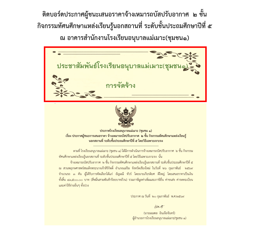 ประกาศผู้ชนะการเสนอราคา จ้างเหมารถบัสปรับอากาศ  ๒ ชั้น กิจกรรมทัศนศึกษาแหล่งเรียนรู้